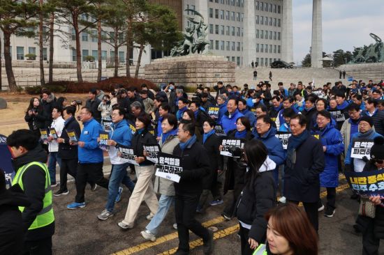 황 대변인은 "국민과 함께 내란에 맞섰던 민주당의 삼족을 멸해야 한다는 전한길을 국회로 부르고, 헌재를 쳐부수자고 선동한 국회의원들의 당적이 바로 국민의힘"이라며 "헌법재판관들을 밟으라고 소리치고, 헌재를 날려버려야 한다는 등의 광기와 폭언이 난무하는 집회에 국민의힘 의원들이 버젓이 참석해 군중을 선동하고 폭동을 조장하는데 왜 이들은 징계조차 하지 않느냐"고 꼬집었다.