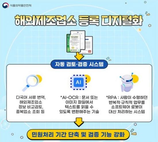 새로운 시스템은 기존 민원 담당자가 직접 검토하던 민원 서류를 AI 머신러닝 기반 광학 문자 인식(AI-OCR), 업무처리 자동화(RPA) 기술 등을 활용해 등록 신청인 정보, 해외제조업소 소재지 등 기초정보를 검토하고 수출국 정부 증명서 등 다국어 서류를 자동으로 번역·비교함으로써 신청 정보 일치 여부, 중복업소 여부 등을 확인한다. AI-OCR(Optical Character Recognition)는 문서 또는 이미지 파일에서 텍스트를 읽을 수 있도록 변환해 주며, RPA(Robotic Process Automation)는 사람이 수행하던 반복적·규칙적 업무를 소프트웨어 로봇이 대신 처리하는 기술이다.