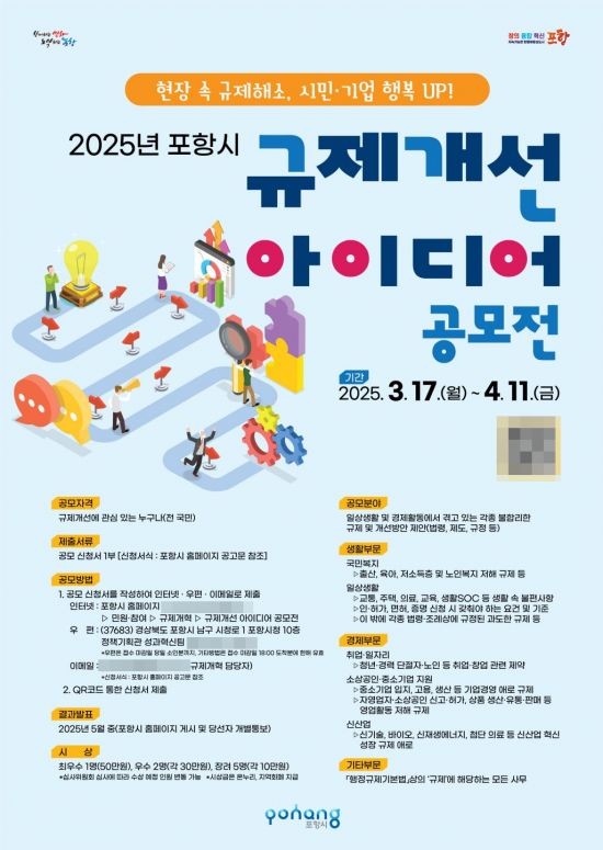 규제 개선에 관심 있는 국민은 누구나 참여할 수 있으며, 포항시 홈페이지 민원·참여(규제개혁-규제개선 아이디어 공모전)에서 서식을 다운받아 게시판, 우편, 이메일로 신청하거나 포스터의 QR코드로 접수할 수 있다.