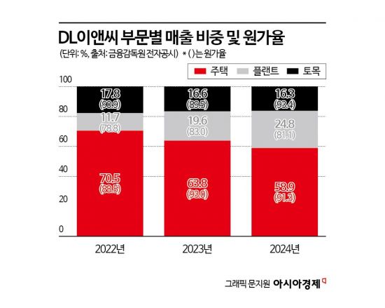 18일 금융감독원 전자공시시스템에 공시된 DL이앤씨의 2024년 사업보고서에 따르면 DL이앤씨의 지난해 주택 사업 매출 비중은 58.9%로 집계됐다. 2022년 70.5%, 2023년 63.8%에 이어 또다시 비중이 줄었다. 반면 플랜트 사업 비중은 2022년 11.7%에서 지난해 24.8%로 2년 만에 곱절로 뛰었다. 토목 사업의 비중은 예년과 비슷한 수준인 16.3%였다.