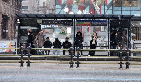 이날 오전 7시45분께 서울 강남역 5번 출구 앞에선 9~10명의 시민들이 보도로 나가지 못하고 서성대고 있었다. 밤사이 많은 눈이 내렸지만 잠시 눈이 그친 탓에 집에서 우산을 가져오지 않은 이들이었다. 도봉에서 강남으로 출근한다는 직장인 김상헌씨(29)는 "오전 6시에 집에서 나올 무렵에는 눈이 안 내리길래 우산을 가져오지 않았는데, 막상 강남역에 도착하고 나니 눈이 많이 내려 옷이 흠뻑 젖었다"고 말했다.