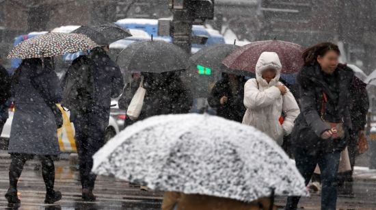 서울 역대 가장 늦은 대설특보가 발효된 18일 서울 종로구 광화문네거리에서 시민들이 눈을 맞으며 출근길을 서두르고 있다.