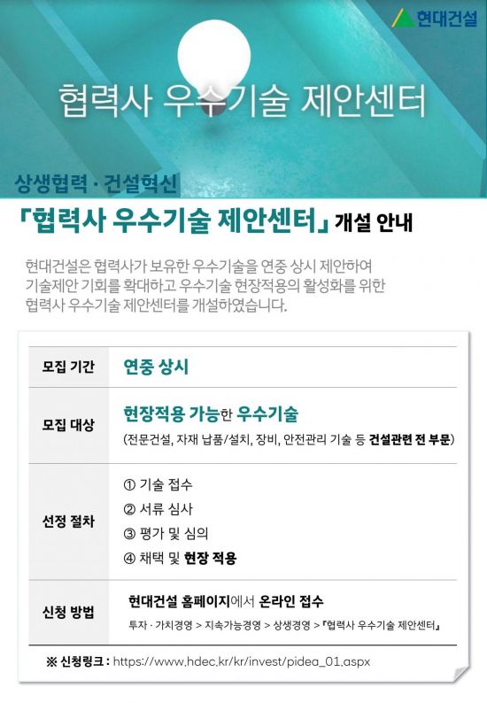 현대건설은 협력사 우수기술 제안센터를 새로 열었다고 18일 밝혔다. 협력 업체가 가진 우수 아이디어를 찾아 현장에 적용하기 위한 체계로 혁신 기술·공법 개발을 장려할 것으로 회사 측은 내다봤다.