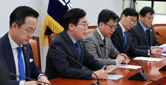 박찬대 더불어민주당 원내대표가 18일 국회에서 열린 원내대책회의에서 발언하고 있다.