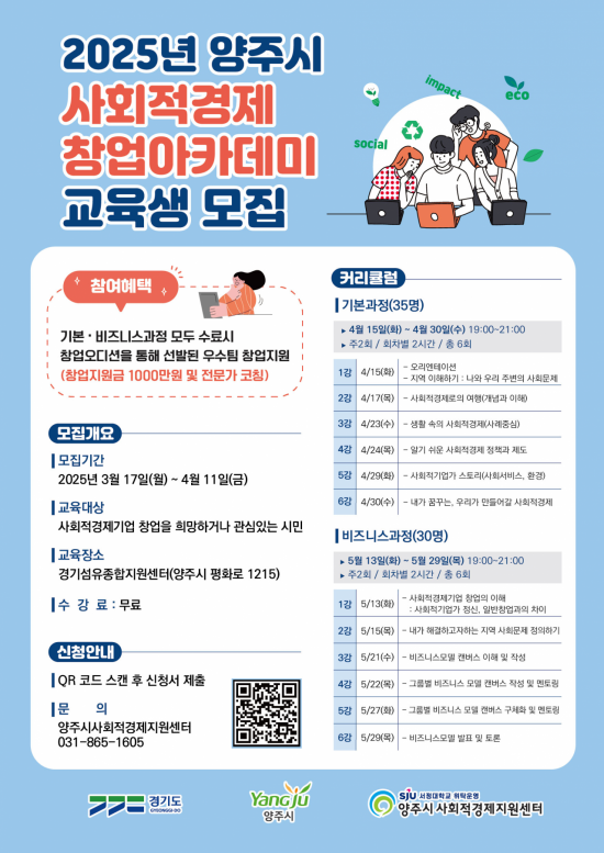 신청은 양주시사회적경제지원센터 누리집 공지 사항에서 신청 링크 또는 QR코드를 통해 가능하며 기타 자세한 사항은 양주시사회적경제지원센터로 문의하면 된다.