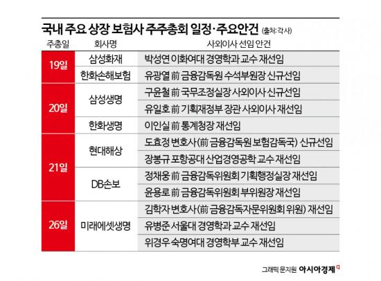 국내 상장 보험사들은 19일부터 오는 28일까지 본격적인 정기주주총회를 연다. 첫 출발은 삼성화재다. 삼성화재는 이날 박성연 이화여대 경영학과 교수를 사외이사로 재선임하는 안건을 의결한다. 삼성화재는 국내 보험사 중 유일하게 여성 사외이사가 2명이다. 삼성화재는 2023년 3월 대법관 출신의 김소영 사외이사를 선임해 여성 사외이사를 2명으로 늘렸다.