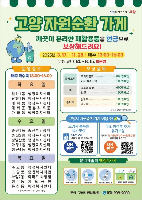 고양 자원순환가게는 18일부터 주 1회(화·수·목) 오후 1시부터 4시까지 운영되며, 덕양구(5개소), 일산동구(5개소), 일산서구(5개소) 등 총 15개소에서 시민들을 맞이한다.