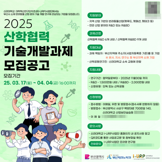 신라대학교 반려동물산업특화 대학혁신연구단지(I-URP) 조성사업단은 부산 지역 반려동물 산업의 기술 경쟁력을 높이고, 관련 기업들의 성장을 지원하기 위해 산학협력 기술개발 과제 공모를 추진한다.
