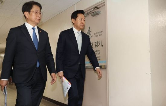 박상우 국토교통부 장관, 오세훈 서울시장이 19일 서울 종로구 정부서울청사에서 부동산 규제, 금융, 투기거래 등 주택시장 안정화 방안 관련 합동 브리핑에 참석하고 있다.