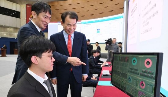9일 서울 여의도 한국거래소에서 열린 공매도 전산 시스템 구축 시연회에서 이복현 금융감독원장과 정은보 한국거래소 이사장이 모의 데이터를 이용한 불법 공매도 적출 방법을 지켜보고 있다.