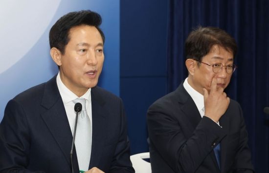 오세훈 서울시장이 19일 서울 종로구 정부서울청사에서 부동산 규제, 금융, 투기거래 등 주택시장 안정화 방안 관련 합동 브리핑을 하고 있다. 이날 브리핑에는 박상우 국토교통부 장관을 비롯해 김범석 기재부1차관, 김소영 금융위 부위원장이 참석했다.