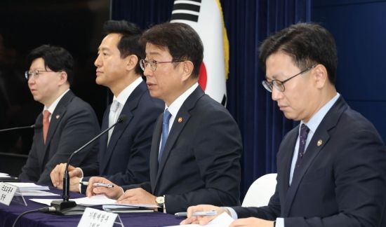 박상우 국토교통부 장관이 19일 서울 종로구 정부서울청사에서 부동산 규제, 금융, 투기거래 등 주택시장 안정화 방안 관련 합동 브리핑을 하고 있다. 이날 브리핑에는 오세훈 서울시장을 비롯해 김범석 기재부1차관, 김소영 금융위 부위원장이 참석했다.