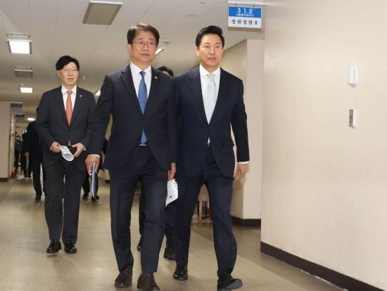 박상우 국토교통부 장관, 오세훈 서울시장이 19일 서울 종로구 정부서울청사에서 부동산 규제, 금융, 투기거래 등 주택시장 안정화 방안 관련 합동 브리핑에 참석하고 있다.