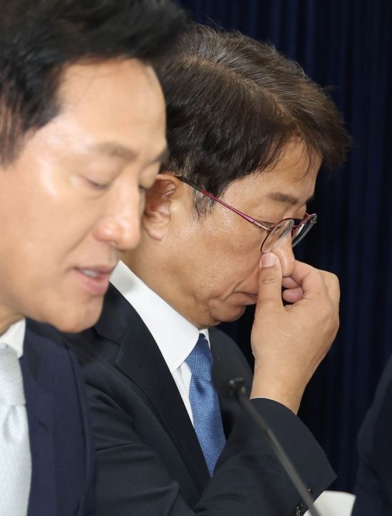 박상우 국토교통부 장관이 19일 서울 종로구 정부서울청사에서 부동산 규제, 금융, 투기거래 등 주택시장 안정화 방안 관련 합동 브리핑에 참석, 생각에 잠겨 있다. 이날 브리핑에는 오세훈 서울시장, 김범석 기재부차관, 김소영 금융위부위원장이 참석했다.
