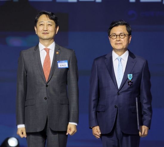 조익성 동아오츠카 부회장이 19일 서울 중구 대한상의에서 열린 '52회 상공의날 기념식'에서 철탑산업훈장을 수상 후 안덕근 산업부 장관과 기념촬영을 하고 있다.