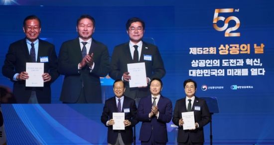 최태원 대한상의 회장이 19일 서울 중구 대한상의에서 열린 '52회 상공의날 기념식'에서 권영세 국민의힘 비대위원장과 박찬대 더불어민주당 원내대표에게 '한국경제 미래를 위한 경제계 제언서'를 전달 후 기념촬영을 하고 있다.