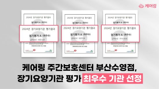 시니어 케어 전문 기업 케어링은 국민건강보험공단이 주관한 ‘2024년 장기요양서비스 제공기관 정기평가’에서 케어링 주간보호센터 부산수영점이 최우수기관에 선정됐다고 20일 밝혔다.