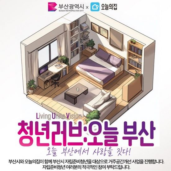 부산시(시장 박형준)는 ‘오늘의집’과 함께 부산 자립준비청년의 거주 공간을 개선하는 ‘청년러브(LUV):오늘부산’ 프로젝트를 추진한다고 20일 알렸다.