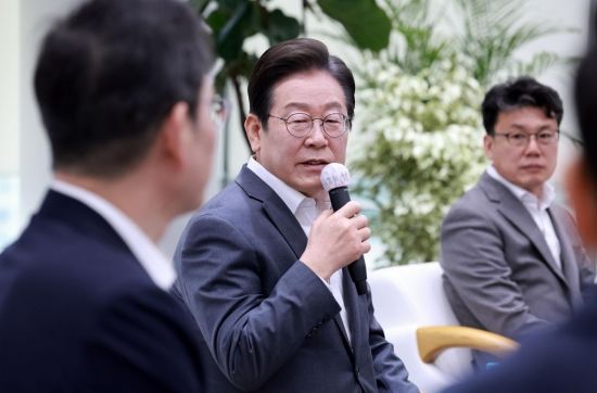 이재명 더불어민주당 대표와 이재용 삼성전자 회장이 20일 서울 강남구 삼성 청년 소프트웨어 아카데미(SSAFY)에서 열린 ‘청년 취업 지원 현장 간담회'에 앞서 환담하고 있다.