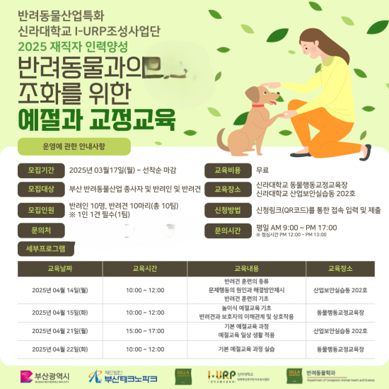 신라대학교(총장 허남식) 반려동물산업특화 대학혁신연구단지(I-URP) 조성사업단이 ‘반려동물과의 조화를 위한 예절과 교정교육’ 프로그램 참가자를 모집한다.