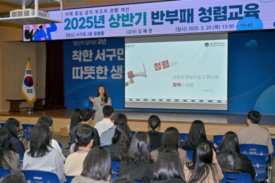 한편 서구는 이번 청렴 교육을 시작으로 캠페인과 청렴 해피콜, 구청장과 함께하는 청렴 토크쇼 등 다양한 청렴 정책을 추진해 청렴한 조직문화를 조성해 나갈 계획이다.