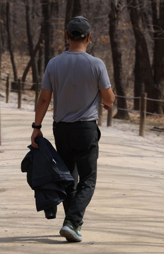 초미세먼지가 나쁜상태를 보이며 서울 낮 최고기온이 14도까지 올라간 13일 서울 삼성동 선정릉을 찾은 사람이 가벼운 옷차림으로 산책을 하고 있다. 기상청을 휴일 비가오고 나면 내주초 반짝 추위가 올것으로 예보했다. 2025.3.13 조용준 기자