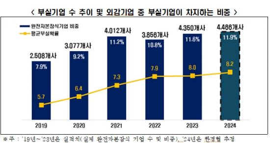 한국경제인협회는 '기업부실예측분석을 통한 2024년 부실기업 진단' 보고서를 통해 올해 외부감사 대상 기업(금융업 제외) 4466곳이 완전자본잠식 상태에 놓일 것으로 추정된다고 24일 밝혔다. 이는 전체 외감기업(3만7510곳)의 11.9% 수준으로, 전년(4350곳)보다 116곳 늘어난 수치다.