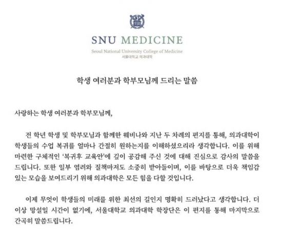 서울대 의대 학장단은 25일 서울대 의대 홈페이지에 게시된 '학생 여러분과 학부모님께 드리는 글'을 통해 "더 이상 망설일 시간이 없기에 이 편지를 통해 마지막으로 간곡히 말씀드린다"며 "이제 용기를 내 부디 복귀해주시길 다시 한번 간절히 요청한다"고 했다.