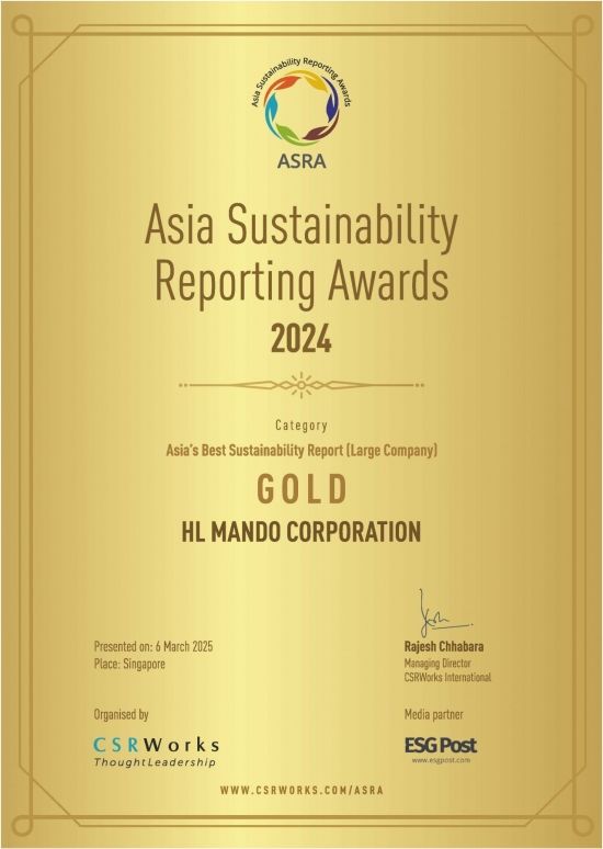 HL만도는 '2024 아시아 지속가능보고서 어워즈(ASRA)'에서 대기업 부문에서는 국내 처음으로 최고 등급인 금상을 받았다고 26일 밝혔다.