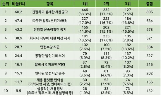 설문조사 결과, 청년 구직자들이 꼽은 최고의 채용 경험으로는 친절하고 상세한 채용공고(60.2%), 따뜻한 말투/분위기/배려(47,4%), 전형별 신속·정확한 통지(43.2%) 등이 포함됐다.