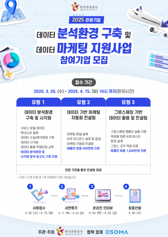 데이터 분석 환경 구축, 마케팅 자동화, 그로스해킹 등 3개 부문에서 총 27개 기업을 선발한다. 관광공사는 2023년부터 이 사업을 통해 데이터를 기반으로 관광기업의 마케팅 전략을 최적화하고 효율적인 성장을 돕고 있다.