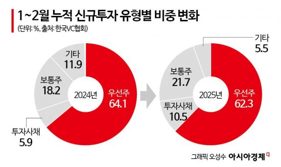 이에 따라 출구 전략도 다변화하고 있다. 올해 1~2월 신규 투자유형을 살펴보면, 투자사채 비중이 지난해 같은 기간 5.9%에서 10.5%로, 보통주 비중이 18.2%에서 21.7%로 올랐다. 우선주 비중은 지난해 동기 64.1%에서 62.3%로 소폭 감소했다. 통상 VC들은 IPO 후 보유 우선주를 매각하는 방식을 선호한다. 시장 자체가 위축되면서 유동성이 보다 높은 보통주 또는 전환사채(CB) 등의 투자 비중을 높인 것으로 풀이된다.