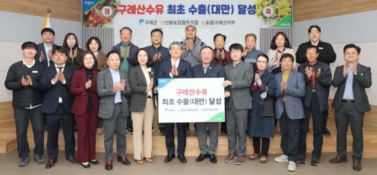 전남 구례군은 지난 1일 구례군 산동농협에서 김순호 구례군수와 허재근 산동농협 조합장, 송해경 농협은행구례군지부 지부장, 산수유 재배 농가 등이 참석한 가운데 구례 산수유 수출 기념행사를 가졌다고 2일 밝혔다.