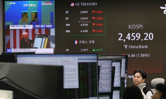 도널드 트럼프 미 행정부가 한국에 25%의 상호관세 세율을 적용한 3일 서울 중구 하나은행 본점 딜링룸에서 딜러가 업무를 보고 있다. 이날 코스피는 전날보다 68.43p(2.73%) 내린 2,437.43으로, 원/달러 환율은 4.4원 오른 1,471.0원, 코스닥은 14.10p(2.06%) 내린 670.75로 시작했다.