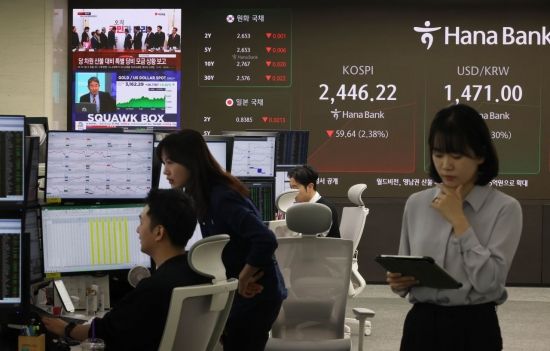 도널드 트럼프 미 행정부가 한국에 25%의 상호관세 세율을 적용한 3일 서울 중구 하나은행 본점 딜링룸에서 딜러가 업무를 보고 있다. 이날 코스피는 전날보다 68.43p(2.73%) 내린 2,437.43으로, 원/달러 환율은 4.4원 오른 1,471.0원, 코스닥은 14.10p(2.06%) 내린 670.75로 시작했다.