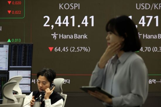 도널드 트럼프 미 행정부가 한국에 25%의 상호관세 세율을 적용한 3일 서울 중구 하나은행 본점 딜링룸에서 딜러가 업무를 보고 있다. 이날 코스피는 전날보다 68.43p(2.73%) 내린 2,437.43으로, 원/달러 환율은 4.4원 오른 1,471.0원, 코스닥은 14.10p(2.06%) 내린 670.75로 시작했다.