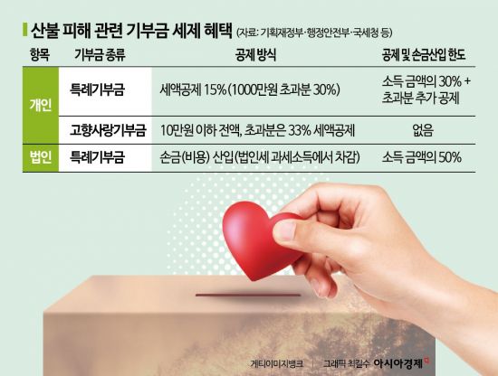 개인과 법인 등이 낸 기부금과 구호 물품은 일반 기부 대비 많은 세제 혜택을 받게 된다. 정부가 울산 울주군과 경북 의성군, 안동시, 청송군, 영양군, 영덕군, 경남 산청군과 하동군 등 8곳을 특별재난지역으로 선포했기에 '특례기부금' 적용이 가능하다. 특례기부금은 국가나 지방자치단체에 무상 기증 금품, 국방헌금과 국군장병 위문 금품, 천재지변으로 생기는 이재민을 위한 구호 금품 등을 포함하는 공익 성격의 기부금으로, 일반 대비 더 많은 세제 지원을 받는다.