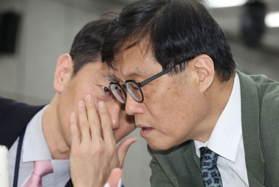 이창용 한국은행 총재(오른쪽)와 이복현 금융감독원장이 3일 서울 중구 은행회관에서 열린 ‘한국은행-한국금융연구원 공동 정책 컨퍼런스’에 참석해 귀엣말을 하고 있다.