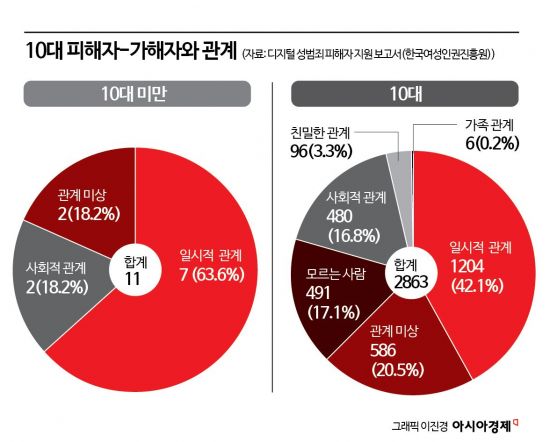 한국여성인권진흥원이 최근 발간한 '디지털성범죄 피해자 지원 보고서(2024)'에 따르면 디지털 성착취 피해를 본 아동·청소년은 가해자와의 관계가 주로 채팅 상대, 일회성 만남 등과 같은 일시적 관계인 경우가 대부분이었다. 10대 미만의 경우 63.6%가 일시적 관계였다. 10대 피해자도 가해자와 일시적 관계였다는 응답이 전체 2863명 중 1204명(42.1%)으로 가장 많았다.