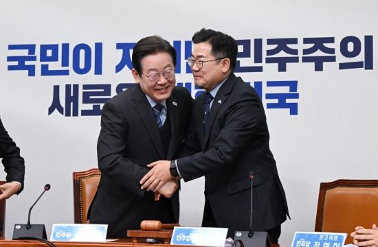 이재명 더불어민주당 대표가 9일 국회에서 열린 최고위원회의에서 사퇴 의사를 밝힌 뒤 권한대행을 맡을 박찬대 원내대표와 포옹하고 있다.