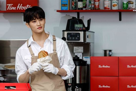NCT 마크가 9일 서울 송파구 롯데월드몰에서 열린 팀홀튼 스페셜 매장 '팀스 키친' 오픈기념 행사에 참석해 포즈를 취하고 있다. 6개월 동안 운영되는 스페셜 매장은 팀홀튼 브랜드 핵심 운영 전략인 ‘올웨이즈 프레시’를 고객이 직접 보고 경험할 수 있도록 특화된 공간이다.