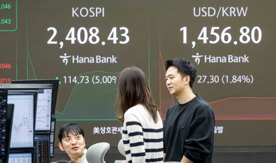 코스피 지수가 미국의 상호관세 유예 소식에 장 초반 5%대 급등하며 매수 사이드카가 발동한 10일 서울 중구 하나은행 본점에서 딜러들이 업무를 보고 있다. 이날 원달러 환율은 전 거래일보다 38.1원 내린 1446원으로 거래를 시작했다.