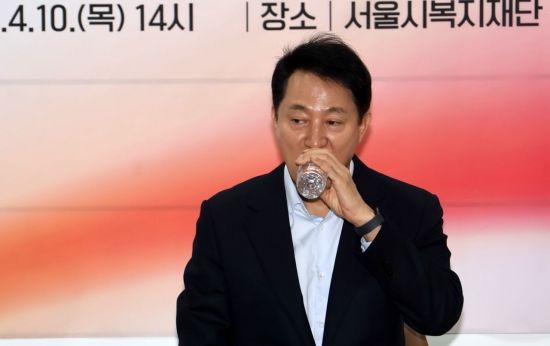 오세훈 서울시장이 서울 마포구 복지센터에서 디딤돌소득 대상 시민들과 간담회를 갖는 도중 물을 마시고 있다.
