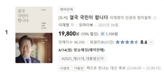 이 전 대표의 저서 '결국 국민이 합니다'(오마이북)는 전날 예약 판매를 시작한 뒤 하루 만인 이날 교보문고, 알라딘, 예스24 등 국내 3대 온라인 서점에서 베스트셀러 1위에 올랐다.