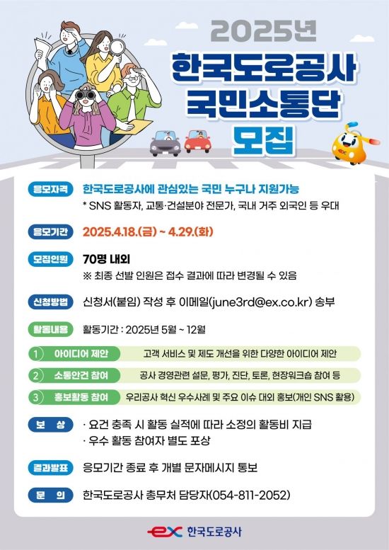 지원자는 한국도로공사 홈페이지에서 지원서를 다운로드한 후 이메일로 제출하면 된다. 접수는 4월 29일까지 진행된다.
