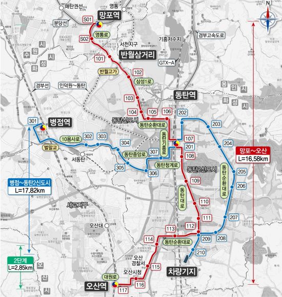 이번에 입찰 공고한 1단계 공사는 총연장 31.55㎞다. 노선은 ▲병점역~동탄역~차량기지 간 17.82㎞ ▲망포역~동탄역~방교동 간 13.73㎞ 등 2개 노선으로 구성됐다. 노선에는 정거장 33개, 차량기지 1개, 교량 1개가 들어선다. 추정 사업비는 6113억9600만원이다.