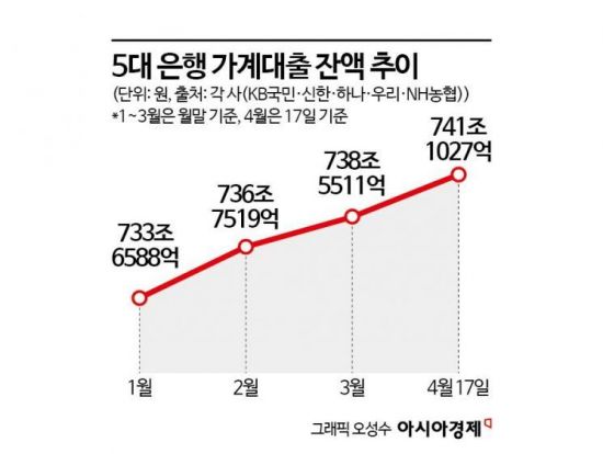 21일 금융권에 따르면 시중 5대 은행(KB국민·신한·우리·하나·NH농협)의 이달 17일 기준 가계대출 잔액은 741조1027억원으로 집계됐다. 이는 3월 말(738조5511억원) 대비 2조5516억원이 늘어난 것이다. 영업일 기준으로 불과 13거래일 만에 전월 증가액(1조7992억원)을 뛰어넘은 것이다. 지금 추세대로라면 신학기 이사수요 등으로 증가 폭이 컸던 지난 2월(+3조931억원)보다도 더 많이 늘어날 수 있다는 우려도 나온다.