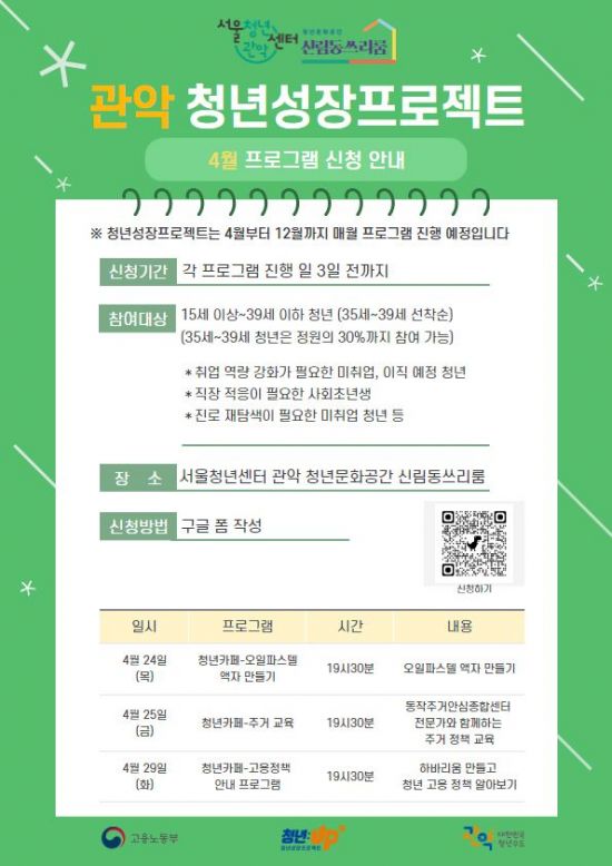 15세 이상 39세 이하 청소년과 청년을 대상으로 오는 12월까지 진행되는 청년성장프로젝트는 관악구청 홈페이지(참여/예약→참여신청→강좌/행사예약) 또는 관악 신림동쓰리룸 블로그에서 매월 신청할 수 있다.