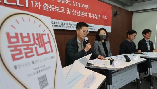 금융소비자연대회의 관계자들이 21일 서울 종로구 참여연대에서 '불불센터 1차 활동보고 및 상담분석 기자회견'을 하고 있다.금융소비자연대회의는 지난 한 달여 동안 '불불센터'(불법사금융·불법추심 상담신고센터)를 통해 접수된 상담 내용을 분석, 제도적 미비점 및 개선방안을 이날 발표했다.
