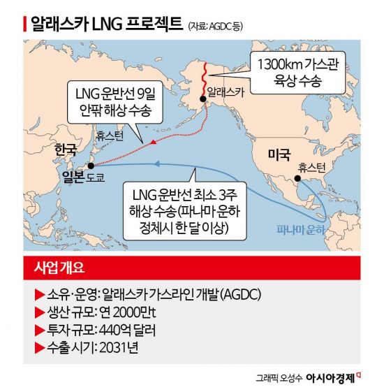 이 프로젝트는 알래스카 북부 가스전에서 시추한 천연가스를 파이프라인으로 남부 니키스키까지 1300㎞ 옮긴 다음 우리나라를 비롯해 일본·대만 등 아시아 국가에 수출하는 초대형 에너지 사업이다. 총사업비가 440억달러(약 62조원)에 달한다. 본격적인 수출은 2031년부터 이뤄질 전망이다. 알래스카 지역에 가스관이 깔리면 한국으로의 LNG 운송 기간은 일주일이 걸릴 것으로 보인다. 대규모 매장지인 미국 텍사스에서 한국까지 수송이 3주가 소요된다는 점을 감안하면 운송기간이 3분의 1로 줄어드는 것이다.